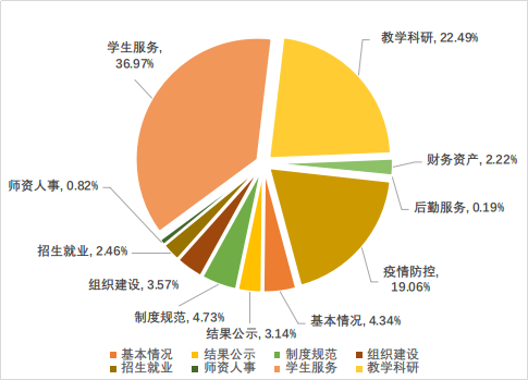 学年,学院主动公开信息约2072条。在主动公开的信息中,包括学院概况、学院领导、内部管理体制等基本情况类信息90条,占主动公开信息的比例为4.34%会议纪要、干部任命、师生获奖奖项评定等结果公示类信息65条,占主动公开信息的比例为3.14%各类办法、规定等制度规范类信息98条,占主动公开信息的比例为4.73%党建方案、支部换届、党员发展组织建设类信息74,占主动公开信息的比例为3.57%本研招生、学生就业信息51条,占主动公开信息的比例为2.46%;团学活动、图书资源使用等学生服务类信息766条,占主动公开信息的比例为36.97%;师资队伍建设和人事任免类信息17条,占主动公开信息的比例为0.82%;各类教学活动安排,以及科研课题、评奖等教学科研类信息466条,占主动公开信息的比例为22.49%;财务制度、收费标准和资产管理等各类财务资产类信息46条,占主动公开信息的比例为2.22%基建维修、招标采购后勤服务类信息4条,占主动公开信息的比例为0.19%新冠肺炎疫情防控数据、院疫情防控工作专报等疫情防控类信息395条,占主动公开信息的比例为19.06%