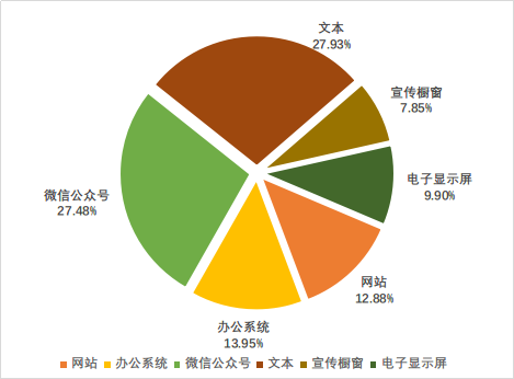 在主动公开的信息中,通过校园网及院外有关机构及部门网站(中直采购网、国家研招网)方式进行公开的信息315条,占主动公开信息的比例为12.88%;通过院内办公系统方式公开的信息341条,占主动公开信息的比例为13.95%;通过文本方式公开的信息683条,占主动公开信息的比例为27.93%;通过宣传橱窗公开的信息192条,占主动公开信息的比例为7.85%通过电子显示屏公开的信息242条,占主动公开信息的比例为9.90%通过微信公众号公开的信息672条,占主动公开信息的比例为27.48%