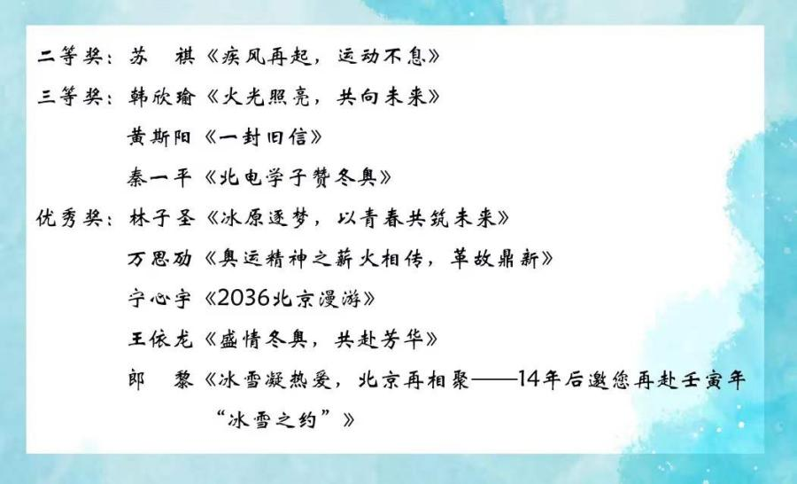 百年风华正青春,决胜冬奥共成长近期,由共青团中央社会联络部、共青团北京市委员会、北京冬奥组委新闻宣传部联合主办的青力冬奥·聚力青春主题征文活动评选结果揭晓。电科9名同学的作品从全国各高校推荐参赛的6000余篇作品中脱颖而出,获得二等奖1项、三等奖3项、优秀奖5项。电科院获奖数量位居全国高校前列,被评为优秀组织单位