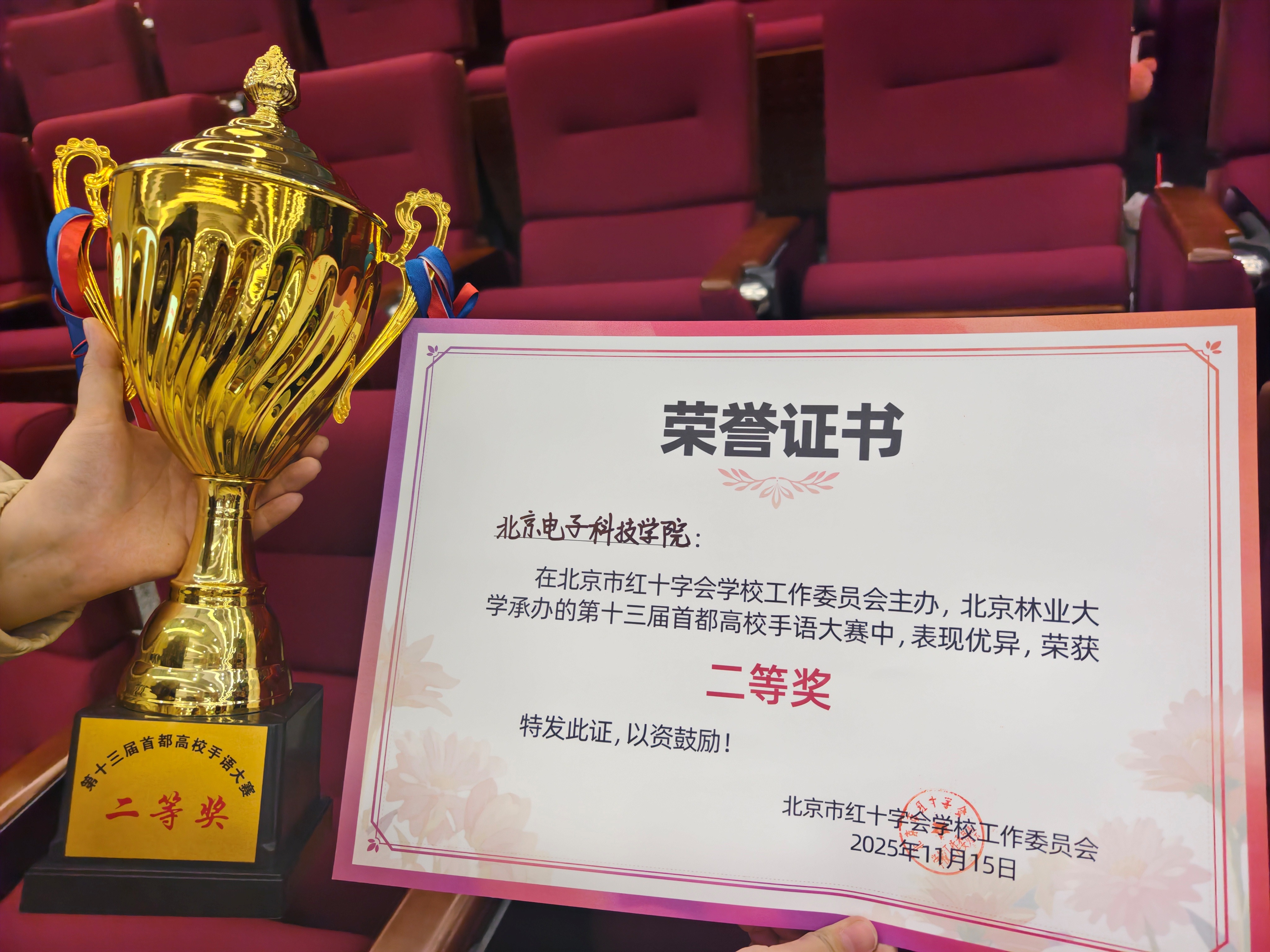 11月15日下午,第十三届首都高校手语大赛决赛在北京林业大学举办,电科院学生社团爱公益联盟“指愿”手语组在本次比赛中表现优异,荣获二等奖。此次比赛包括手语展示、手语歌、手语情景剧等环节。我院学生表演曲目《看见我》和情景剧《除了听,我们什么都可以》,同学们用手语动作在有声与无声的世界间架起桥梁,于无声处彰显了青年一代的善意、担当与力量。