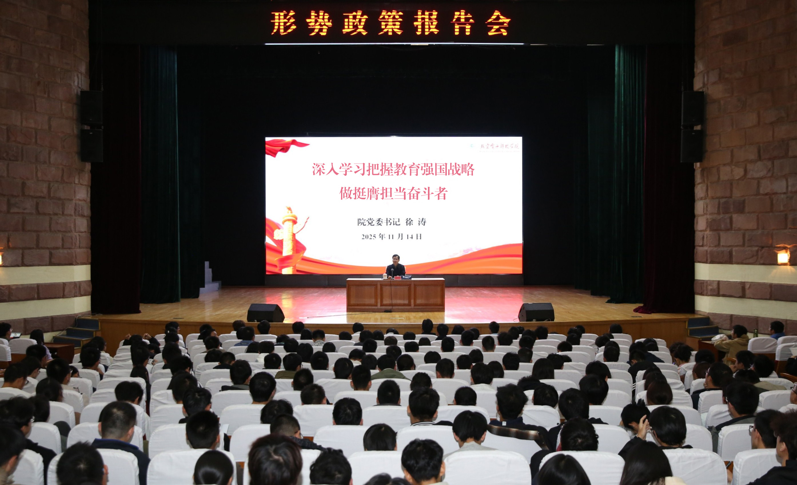 11月14日下午,电科院举办形势政策报告会,院党委书记徐涛同志作题为“深入学习把握教育强国战略 做挺膺担当奋斗者”的报告。学院2000余名学生参加。