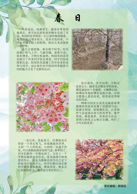 “东园垂柳径,西堰落花津。”二月寒尽,三月风起,新学期的符号,便是温柔的天气和慢慢变好的自己。每一个春天,都是大自然新生的顺意;每一次新的开始,都是我们留给自己的欢喜。伴随着新学期的序曲,就让三月团刊记录下我们初春的踪迹和远方的诗意。