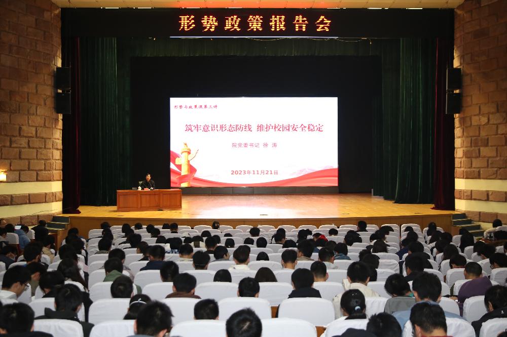为深入学习贯彻习近平文化思想,切实加强学院意识形态工作,11月21日下午,电科院举办专题报告会,院党委书记徐涛同志作题为“筑牢意识形态防线、维护校园安全稳定”的专题报告。学院2000余名师生聆听报告。